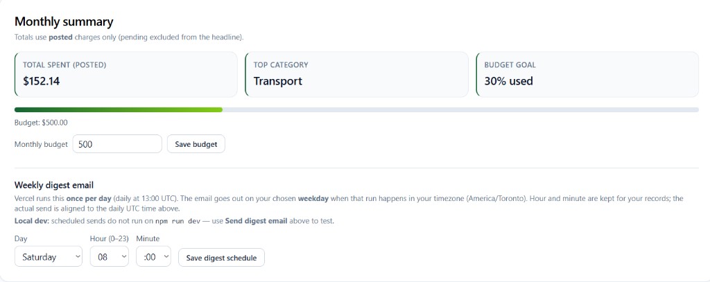 Track monthly spend with posted totals, top category, and progress towards set budget all in one view.